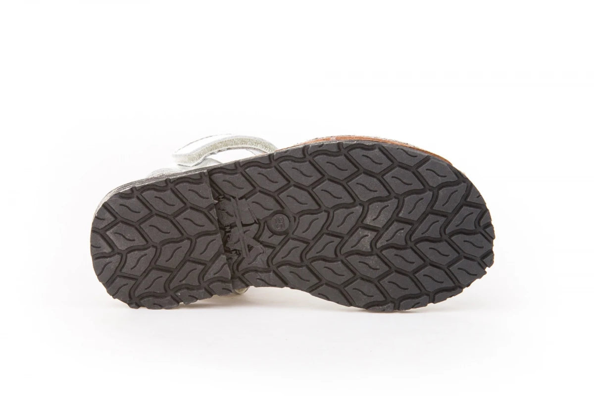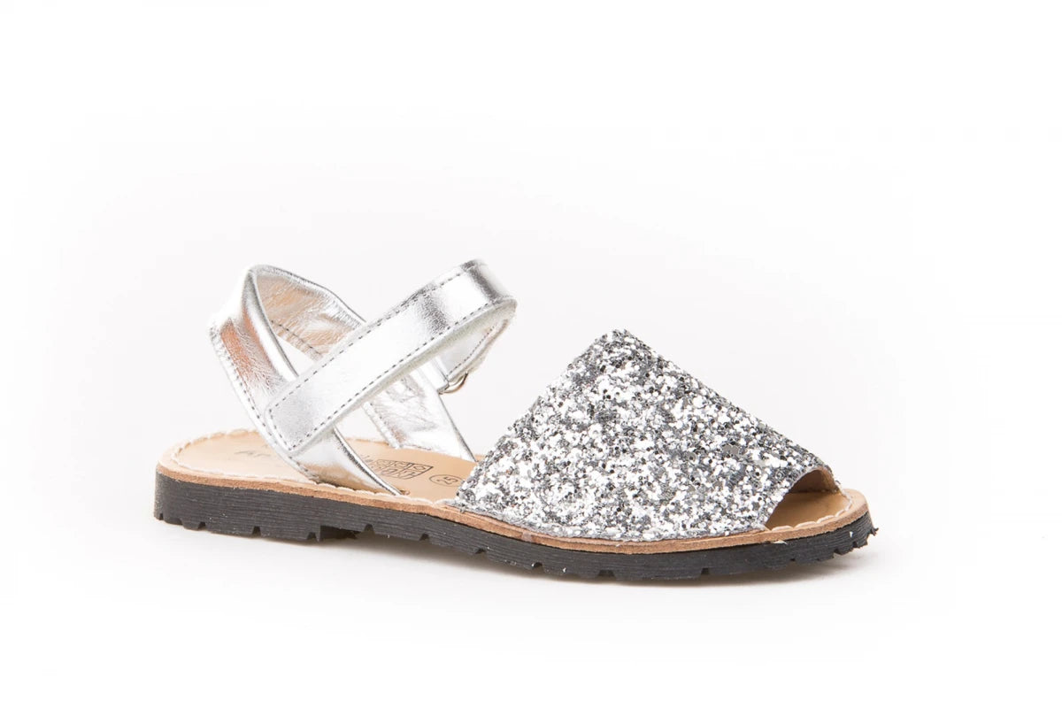 Chaussures type minorquine fabriquées en cuir nappa de vache métallisé et verni, avec un tissu pailleté et un système de fermeture velcro Go & Back. L'intérieur est en cuir naturel avec une semelle en cuir recyclé et une semelle en caoutchouc antidérapante.