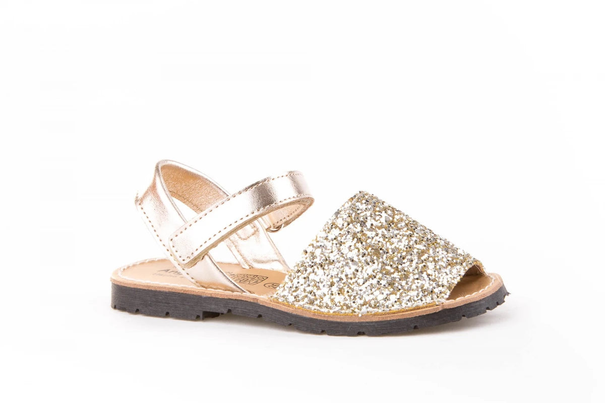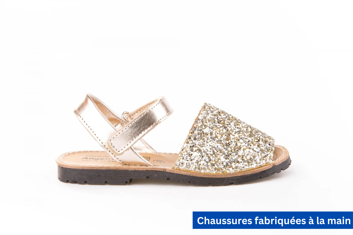 Chaussures type minorquine fabriquées en cuir nappa de vache métallisé et verni, avec un tissu pailleté et un système de fermeture velcro Go & Back. L'intérieur est en cuir naturel avec une semelle en cuir recyclé et une semelle en caoutchouc antidérapante.